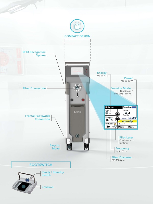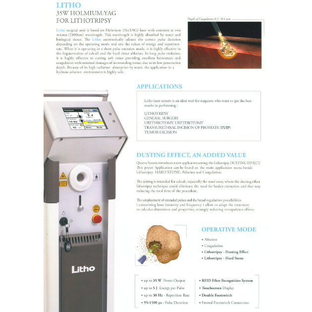 Litho鈥雷射系統具高效的止血功能,大幅降低了病人於術中的出血量,所以治療後的恢復期明顯較短。此外,對於組織不會造成深層的熱傷害(僅0.2~0.3mm)。Lithotrispy Dusting Effect設定適用於將結石擊碎到細緻微小,細碎成沙,其中Dusting碎石術效果更能減少手術的總時間。此功能亦可照結石尺寸和性質來調整脈衝長短可大量減少後縮效。 -