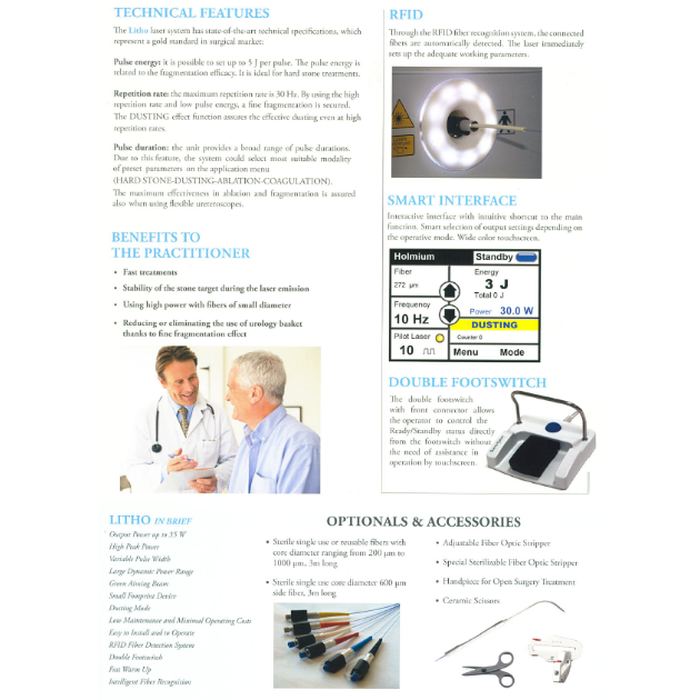 Holmium Surgical Laser Family 鈥外科雷射系統適用於切開、切除、燒灼、汽化、軟組織凝血與止血及適用於開放性手術、腹腔鏡及內視鏡應用。 其原理將組織內含有的水加溫至汽化,並產生許多微小氣泡相互振盪;軟組織隨之逐步汽化,或被切割成塊移除,而被切割下來之軟組織可做為化驗標本,做進一步分析及確診。2080nm ~ 2100nm之波長會被水吸收,透過水做為介質轉換為熱能,使組織的溫度升高達到汽化效能,因此在手術過程中會全程使用生理食鹽水輸入病人體內保持循環,另因雷射在擊發過程中會被水吸收,故光纖貼近軟組織才能進行汽化,但相對安全性較高,比較不容易導致雷射穿透組織造成傷害。